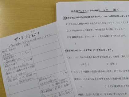 学習のまとめとして、暗記型のプリント「終われま10!」や、振り返り学習の「プレテスト」をしています。
