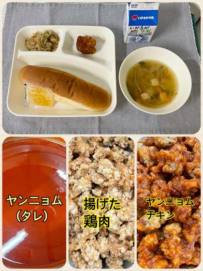 給食ではコチュジャン・こいくちしょうゆ・ケチャップ等で作ったタレに、揚げた鶏肉を絡めています。甘辛くおいしいです。