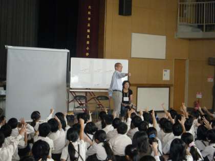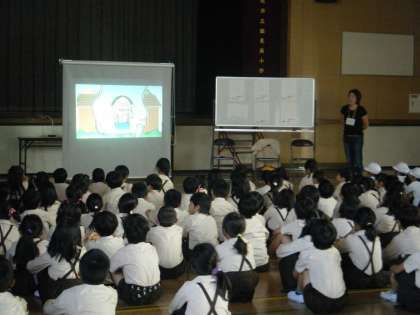 10月13日(火)1年生から4年生の低・中学年が「鶴南イングリッシュ・デイ2」をしました。6月6日の土曜授業で行った1回目は2学年ずつでしたが、今日は1学年ずつじっくり取り組むことができました。初めにフォニックスの歌や体操でウォーミングアップした後、This is the wayという歌で、顔を洗ったり歯を磨いたりする毎朝の動作の言い方を身に付けました。最後にEddy先生が"NIGHTY NIGHT,LITTLE GREEN MONSTER"という絵本を読んでくださいました。体の部分や色の英語の言い方をリピートしながら楽しく聞きました。