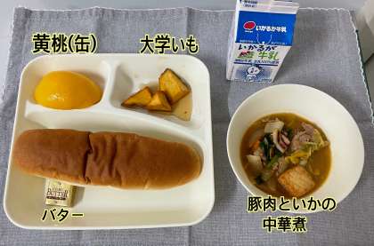 ※豚肉といかの中華煮 ※大学いも ※黄桃(缶) ※大型コッペパン