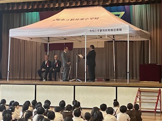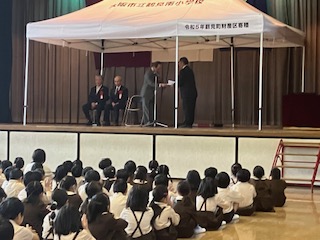 鶴見町財産区より鶴見区地域活動協議会を通じて、テント15基を寄贈していただきました。感謝状を贈呈し、児童代表よりお礼の言葉を申し上げました。