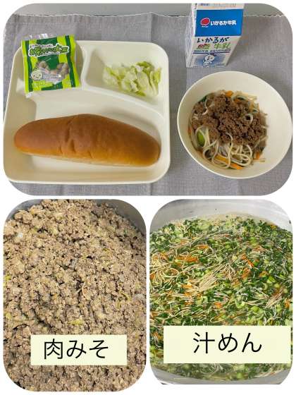給食のタンタンめんはチンゲンサイなどの野菜が入った汁めんの上に、テンメンジャンや赤みそなどで味付けした肉みそをのせて食べます。