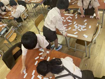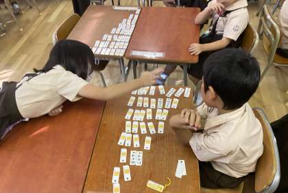 「たしざん」の学習では、たしざんカードを使ってゲームをしたり、「かたちあそび」の学習で、集めた様々な形の箱からどんなものが作れるかグループの友達と一緒に考えたりしました。どんどん積み上げたり、横に並べたりすることで、形の特徴を活かしながら色々なものを作りました。