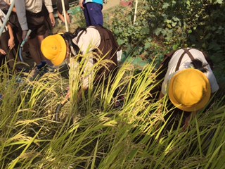 10月20日(火)5年生は社会科学習の一環として、学習園のミニ水田でイネを育ててきました。(本校では勝手に「ツルナンコマチ」と名付けています)秋になってイネの穂も実ってきたので、稲刈りをしました。初めて鎌を持つ子どもも多くいたので気を付けながら行いました。この後刈り取ったイネを干して、脱穀し、精米して少しずつですが試食する予定です。
