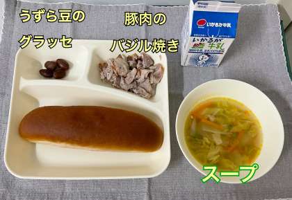※豚肉のバジル焼き ※スープ ※うずら豆のグラッセ