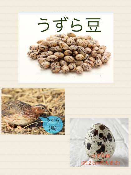 うずら豆は大きさが約1.5cmの豆です。皮に黒色のまだら模様があります。この模様が、うずら卵の殻やうずらという鳥の色合いに似ていることからこの名がつきました。食物繊維を多く含み、ビタミンやカルシウムなどの栄養素も含んでいます。ほくほくした食感で、スープやサラダ、甘煮や煮込み料理などさまざまな料理に使用することができます。