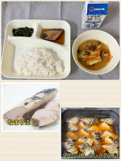 ※なまりぶしのしょうが煮 ※なめこのみそ汁 ※ほうれんそうのごまあえ
