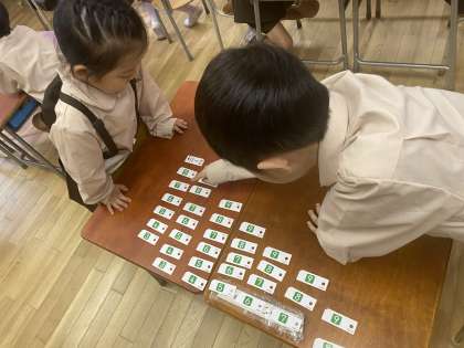 算数科では、「ひきざん」の学習に取り組んでいます。引き算カードの秘密をペアで考えました。並べたカードを見ながら「右側の数がふえると答えがへるね!」「こたえが9になるカードが多いね」などたくさんの秘密を見つけました。