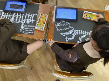 図工科では、「ほねほねきょうりゅう」を描いています。白色のパスをくるくる動かしながら骨を描いていきます。完成が楽しみです。