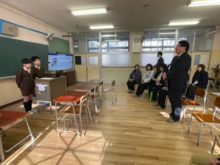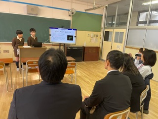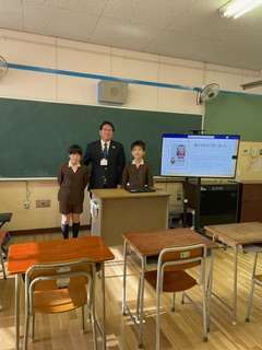 6年生の溝上結彩さんと水島雄大さんが「鶴見区の未来」をテーマに、環境美化や防犯の視点でのまちづくりについて発表し、内田区長様に聞いていただきました。他都市の取り組みを調査した上で、今の鶴見区に何が必要か、自分の考えをしっかりと伝えることができました。内田区長様からは、これから取り組もうとしている鶴見区の施策を紹介していただき、二人の考えの共通点をご指摘してくださいました。すばらしい発表だと褒めていただきました。