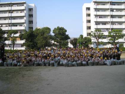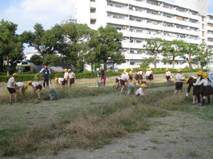 10月22日(木)25日に行われる大阪マラソンに向けて、大阪市内をきれいにしようという「大阪マラソンクリーンアップ作戦」に、4年生が参加しました。初めに町会やPTAの方に「いつも公園をきれいにしていただいてありがとうございます。今日は私たちががんばってそうじをします。」とあいさつしました。その後、手分けして公園や広場を熱心にそうじしました。ごみはあまり多くなかったですが雑草を抜いて、45リットルの袋が35にもなりました。これからもふだんから地域をきれいにしてほしいですね。