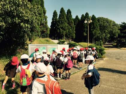今日は待ちに待った秋の遠足で、鶴見緑地公園に行ってきました。鶴見緑地公園では、班の友達と一緒に協力し、秋見つけをしながらフィールドワークをしました。地面をよく見ると落ち葉やどんぐり、松ぼっくりが落ちています。みんなで楽しく拾うことができました。また、いくつかのチェックポイントでは、先生からのクイズに答えながらゴールを目指しました。