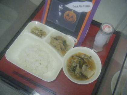 鶏肉のごまだれ焼きは、鶏肉、たまねぎ、ピーマンを練りごま、砂糖、みりん、しょうゆで下味をつけ、ごまをかけて蒸し焼きにした焼き物献立でした。ソーキ汁は茹でることで余分な脂を落とした豚バラ、こんぶ、だいこんなどの野菜が入った汁物献立でした。もやしのしょうが風味あえは、茹でたもやしを手作りのしょうが風味のタレで和えた、和え物献立でした。