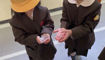 「冷たい〜!」と言いながらも、自然にできた氷に驚く子どもたち。