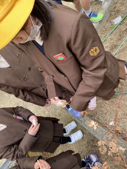 生活科では「冬さがし」をしています。今週はとても寒かったので、運動場の水たまりで凍っているところを見つけました。