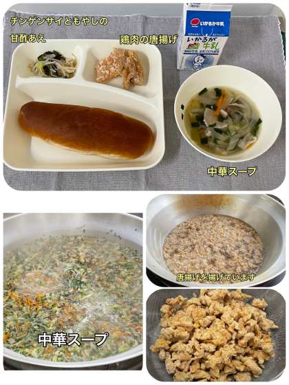 ※鶏肉のからげ ※中華スープ ※チンゲンサイともやしの甘酢あえ