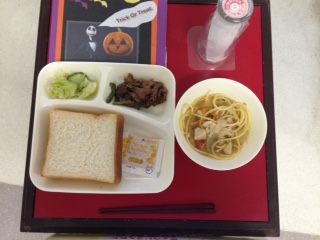 本日の献立は「牛肉のカレー風味焼き・トマトのスープスパゲッティ・キャベツときゅうりのピクルス・パン・牛乳」でした。