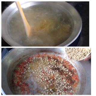写真中央はトマトのスープスパゲッティの調理の様子です。