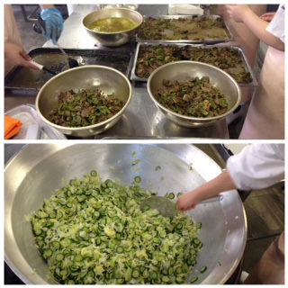 写真右は牛肉のカレー風味焼き、キャベツときゅうりのピクルスの配缶の様子です。