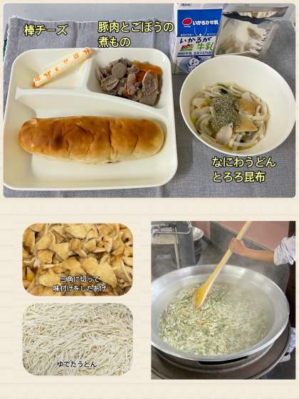 ※豚肉とごぼうの煮もの ※なにわうどん ※棒チーズ