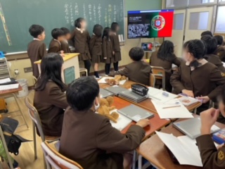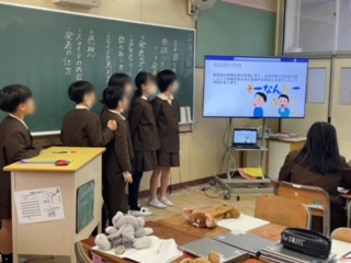 子どもたちは日本語と外国語の違いについて調べ、1人1台学習者用端末を使ってパワーポイントでまとめ、それをもとに発表しました。