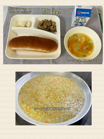 ※豚肉のカレー風味焼き ※コーンとはくさいのスープ