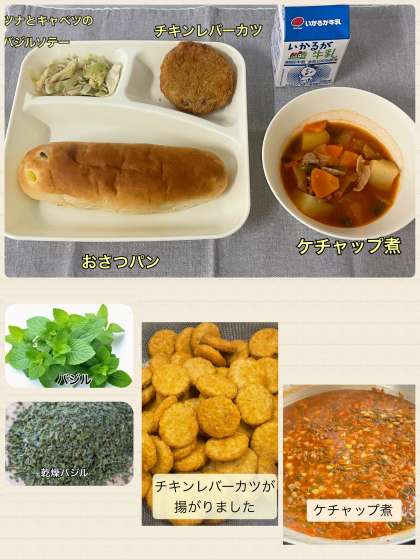 バジルはしその仲間です。一般的に食べられているのはスイートバジルで、さわやかな香りのハーブです。生ではパスタやピザ、サラダに使用したり、乾燥させたバジルはスープや煮込み料理に使用します。今日の給食のバジルソテーには乾燥バジルを使用しています。