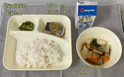 ※さごしのおろしじょうゆかけ ※さといもと野菜の含め煮