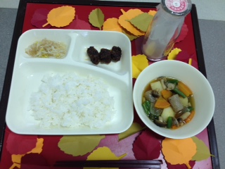 11月初めの本日の献立は、「くじらのオーロラ煮・じゃがいもと野菜の煮もの・もやしのゆずの香あえ・ごはん・牛乳」でした。