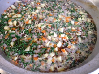 くじらのオーロラ煮は、年に一度、給食に登場するくじらを、しょうがで下味を付け、でんぷんをまぶして揚げました。そして、ケチャップ、砂糖、みそで作った、手作りのオーロラソースをからめた珍しい献立です。じゃがいもと野菜の煮ものは、じゃがいもを主材として、にんじん、たまねぎ、しめじ、三度豆などの野菜がたくさん入った煮もの献立でした。もやしのゆずの香あえは、もやしを塩茹でし、ゆず果汁が入った手作りのタレで和えた、和え物献立でした。