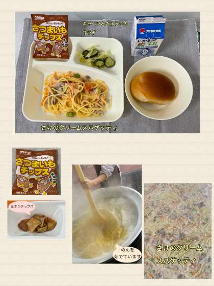 ※さけのクリームスパゲッティ ※キャベツときゅうりのサラダ