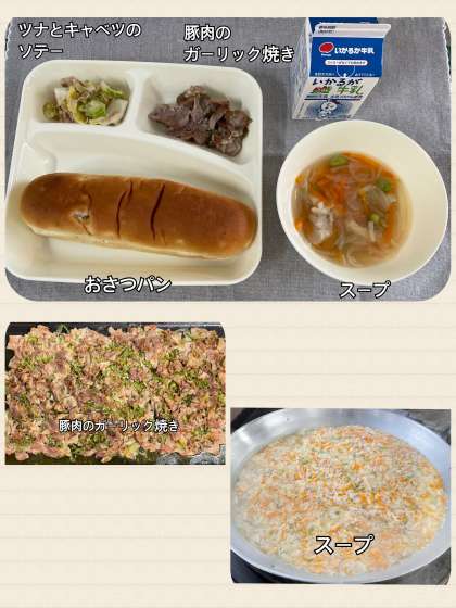 ※豚肉のガーリック焼き ※スープ ※ツナとキャベツのソテー