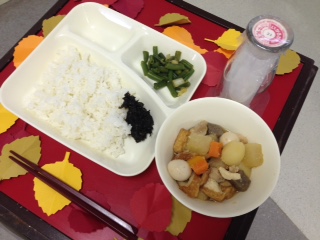 明日の献立は「さごしのおろしじょうゆかけ・すまし汁・五目豆・ごはん・牛乳」です。すまし汁は「ふ」の個別対応献立となっています。明日も楽しみにして下さいね。