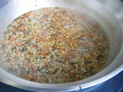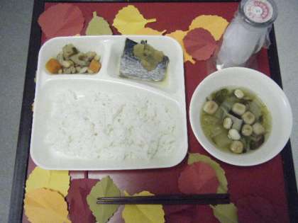 さごしのおろしじょうゆかけは、塩で下味をつけたさごしを焼き物機で蒸し焼きにし、大根おろしがたっぷりと入った手作りのおろしじょうゆだれをかけた、焼き物献立でした。すまし汁はだしこんぶ、けずりぶしで取っただしに、はくさい、しいたけ、ふなどが入った汁物献立でした。五目豆はだしに、にんじん、れんこん、切りこんぶ、大豆が入った煮もの献立でした。