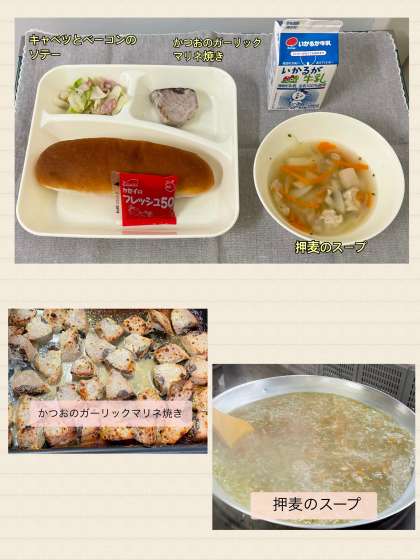 ※かつおのガーリックマリネ焼き ※押麦のスープ