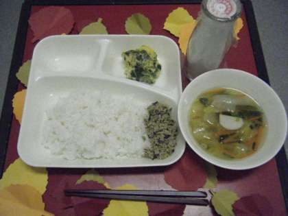 本日の献立は「千草焼き・すまし汁・ツナっ葉いため・ごはん・牛乳」でした。