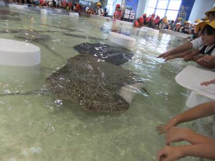 海遊館の中では、グループで仲よく見て回りました。ジンベエザメの大きさに驚いたり、カワウソやアザラシのかわいさに感激したりしていました。また、ラッコやペンギンに餌をあげている様子も見学し、ペンギンの生の声をきくことができたグループもあるようです。ふれあい水槽では、エイやサメを手で触り、ヌルヌル・ザラザラ感を肌で感じることができました。