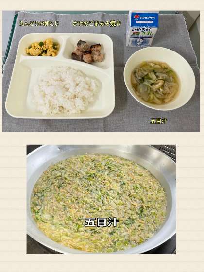 ※さけのごまみそ焼き ※五目汁 ※えんどうの卵とじ
