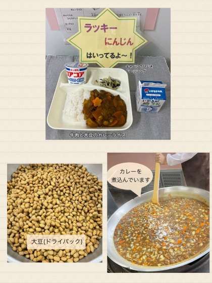 ※牛肉と大豆のカレーライス ※キャベツのひじきドレッシング