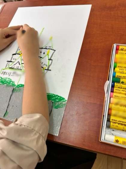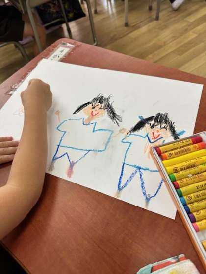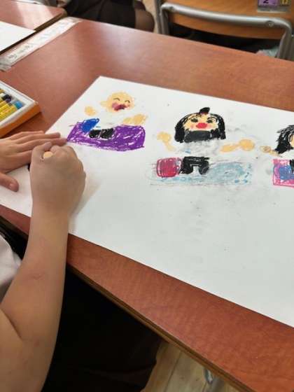 一年生は遠足の様子を絵にかいていました。みんな遠足が楽しかったようですね。いっしょうけんめいにクレヨンを動かしていました。