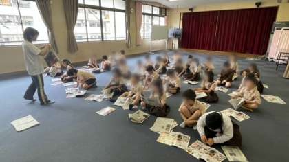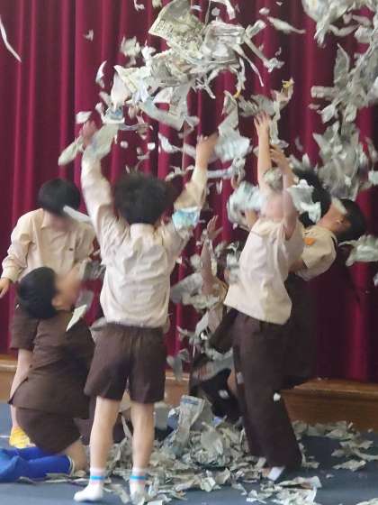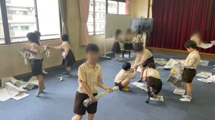今日の2年生は図工では、新聞紙を使いました。新聞紙を畳んだり伸ばしたり投げたり、新聞紙を使って、とても楽しむことができました。