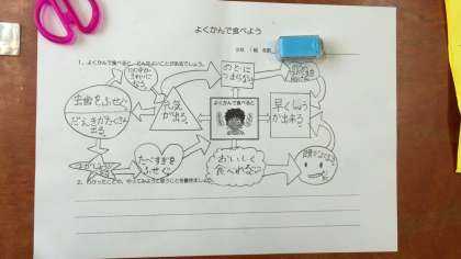 11月13日(金)今日は3年生が栄養について学習しました。テーマは「よくかんで食べよう」です。初めに栄養士の先生から「よくかんで食べるとどんなよいことがあるでしょう」ときかれて、子どもたちからは「のどにつまらない」「おいしく食べられる」「早くしょうかができる」などと次々と手が上がりました。先生とのやりとりで、この他にも「頭がよくなる」「食べすぎをふせぐ」「虫ばをふせぐ」等もわかりました。続けて「じゃこ豆」の献立を例に挙げて、給食でもよくかんで食べることが大切ですねというお話がありました。3年生の子どもたちはワークシートに「よくかんで食べるといいことがいっぱいあるので、これからは今までよりもっとよくかんで食べようと思いました」と感想を書いていました。