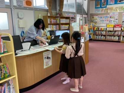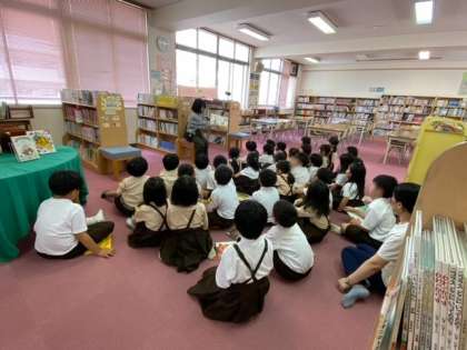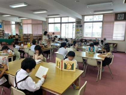 図書の学習です。自分で読みたい本を選んで借りました。司書の上野先生に絵本の読み聞かせもしていただきました。