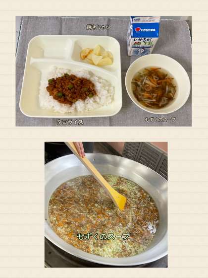 ※タコライス ※もずくのスープ ※焼きじゃが ※牛乳