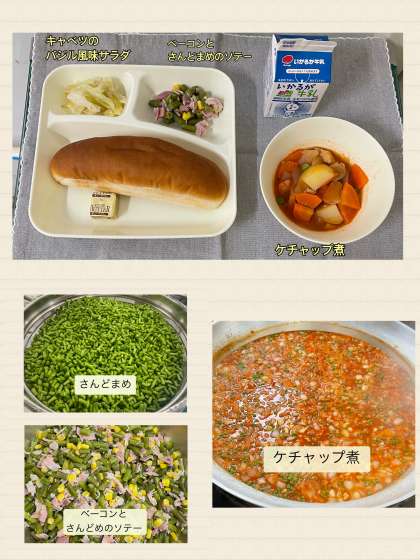 ※ケチャップ煮 ※ベーコンとさんど豆のソテー