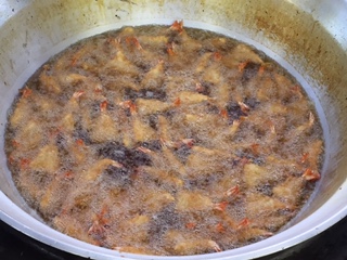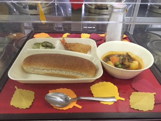 えびフライは冷凍のまま熱した油で揚げた、揚げ物献立でした。牛肉のケチャップ煮は牛肉、にんじん、たまねぎ、じゃがいもなどが入った、ケチャップ味の煮もの献立でした。キャベツときゅうりのサラダは塩ゆでした野菜を、手作りのドレッシングで和えた和え物献立でした。