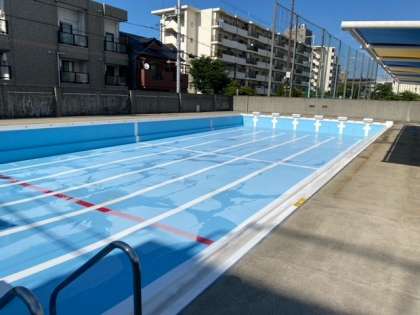 新しい綺麗な水を注入し、水泳授業にむけての準備が完了します。