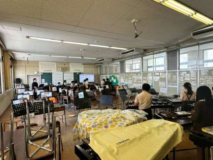 5年生の音楽では合奏の練習をしていました。楽器ごとにパートに別れて、みんなで相談して入るタイミングを工夫したそうです。完成した合奏を聞かせてくれました。