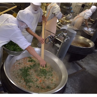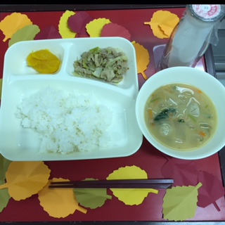 豚肉とまいたけのいためものは豚肉を旬のきのこ、まいたけやキャベツと炒め、仕上げにしょうゆで味付けした、炒め物献立でした。つみれ汁はだしに、しょうが汁や料理酒で下味をつけた、つみれや、だいこん、ごぼうなどが入った、汁物献立でした。かぼちゃういろうは、かぼちゃのペースト、砂糖、上新粉を水で溶き、焼き物機で蒸したデザート献立でした。