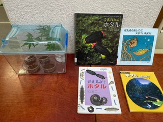 グリーンマットで飼育中です。またホタルの関連図書も展示しています。
